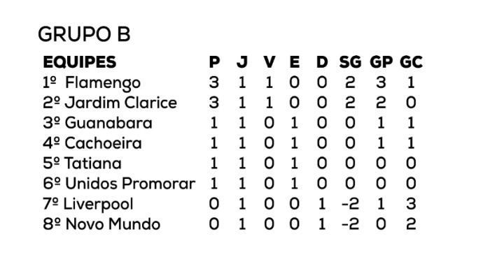 os demais jogos ficaram no empate e com isso somaram 1 ponto são eles : Guanabara e Cachoeira por 1 a 1, no Clarice, e sem gols os confrontos entre Tatiana e Unidos Promorar e por fim Jardim Paulista e Palmerinha.